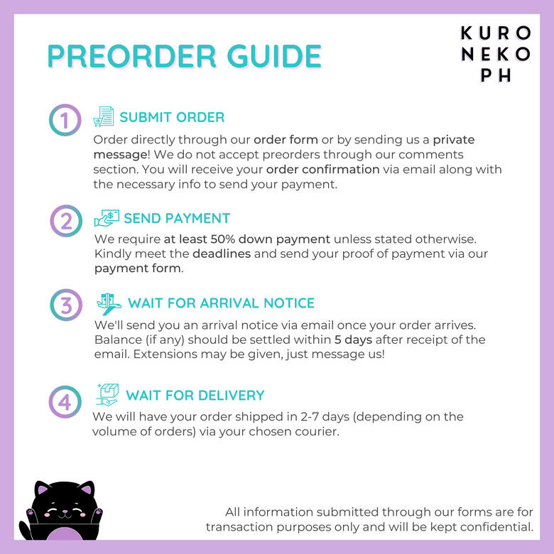 Cancellations are not allowed. Otherwise, we'll not allow you to join our future group orders unless it's PAYO*. You will also not be eligible for any shop promotions, perks and discounts (if any).Products for preorder come from different suppliers overseas so delays are inevitable. ETA* is 2-4 weeks after the preorder cut-off unless stated otherwise.Some products may run out of stock without prior notice. We'll notify you if there are other variations available, then you may choose to change the variation (if applicable) or remove the item from your order.We normally use air freight delivery to expedite the transit time but we cannot give an exact date for their arrival. For bulky items, we use sea shipping (longer ETA) to save on the ISF*.Orders must be claimed within 2 months after receipt of arrival notice.We may issue discounts or refunds at our discretion for severely damaged goods received from our supplier.